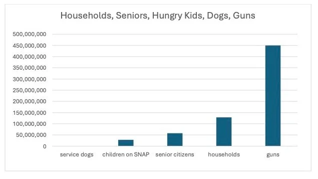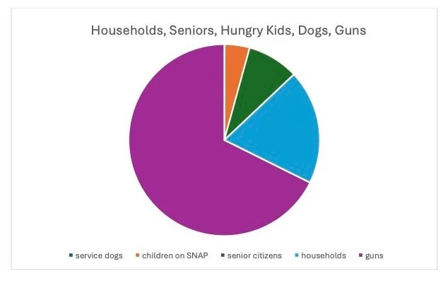 If you believe the free possession and transport of guns, willy nilly, has not made our country unsafe and unwholesome, you and I live on two different planets. (Chances are you don’t care much for sentence structure either.) Thank you for working through this little lesson with me, though. As a reward, I’m offering you two quick, easily interpreted graphics about the subjects our four sentences above dealt with: senior citizens, hungry kids, service dogs, households, and guns. No relation to sentence structure. What do you think?
